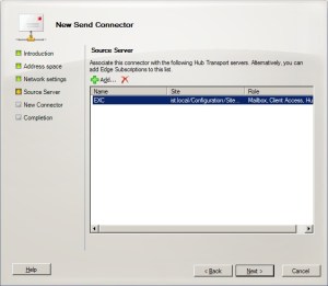 Source Server kısmında, “Hub Transport” veya “Edge Subscription” serverlarımızı belirtmemiz isteniyor. Test ortamında bütün rollerimizi tek bir sunucu üzerinde kurduğumuz için “Next” diyerek devam ediyoruz.