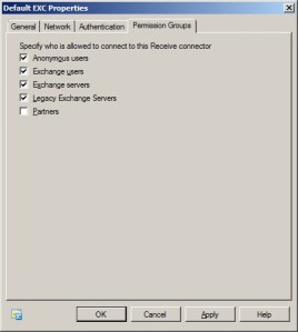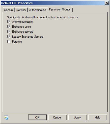 Burada listelenen “Recieve Connector”lerden “Default” receive connector’e çift tıklayarak özellikler penceresinin açılmasını sağlıyoruz. Açılan özellikler penceresinin en sağ kısmındaki “Permission Groups” sekmesinde “Anonymous useres” ı seçerek, internet üzerinden kendi organizasyonumuz dışında gelen maillerin serverımız tarafından kabul edilmesi iznini veriyoruz.