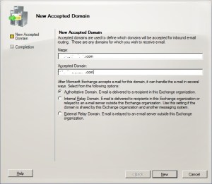 Accepted Domains : Dış dünyada kullanacağımız alan adımızı Exchange Server’ımız üzerinde belirtmemiz gerekir. Bunun için, Exchange Management Consol’da Organization Units > Hub Transport > Accepted Domains kısmına geliyoruz. “New Accepted Domain” diyerek işlemlerimize başlıyoruz.