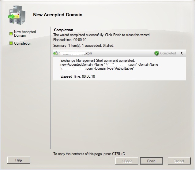 Sihirbaz “Accepted Domain”imizin başarı ile eklendiğinin bilgisini veriyor, bu ekranı “Finish” diyerek kapatıyoruz.