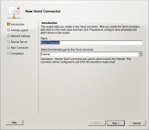 Karşımıza çıkan sihirbaz bizden tanımlayacağımız “Send Connector” için bir isim ve ne için kullanacağımızı bilgisini istemekte. “Send Connector”ümüzün ismini girip “Internet” seçeneğini seçerek “Next” diyoruz.