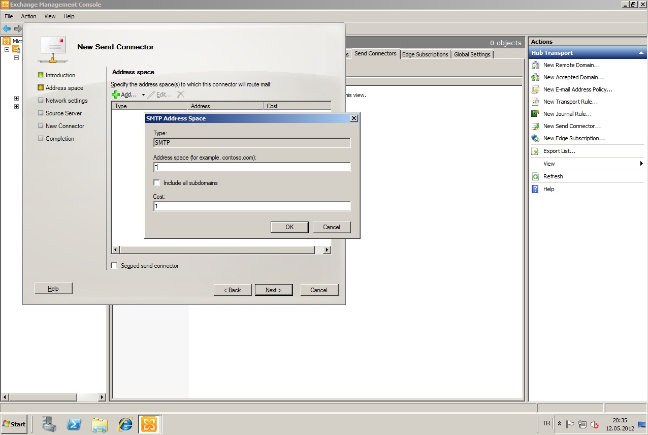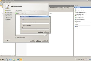“Address Space” kısmında, sihirbaz bizden gönderim yapacağımız domainler hakkında bilgi istiyor. İlk olarak “Add” butonuna basıyoruz ve sihirbazın bizden istediği bilgileri giriyoruz. Burada “Adress” kısmına “*” koyuyoruz çünkü biz bütün domainlere gönderim yapmak istiyoruz. Ama sadece belli domainlere gönderim yapmak isteseydik “*” yerine bu domainleri girmemiz gerekiyordu. Eğer belli domainlere mail göndermek istiyorsak ve bunlarında alt domainleri var ise “Include all subdomains” seçeneğini seçmemiz gerekiyordu. “Ok” diyerek bilgi girişini tamamlıyor ve “Next” diyerek sihirbazın diğer adımına geçiyoruz.