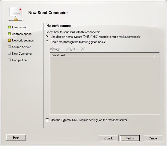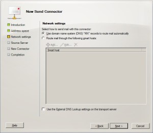 “Network Settings” kısmında, “Use domain name system (DNS) “MX” records to route mail automatically” seçerek devam ediyoruz. Bu seçenek ile Exchange Server”ımız kendisi dns sorgusu yaparak gerekli mx kayıtlarına ulaşacak.